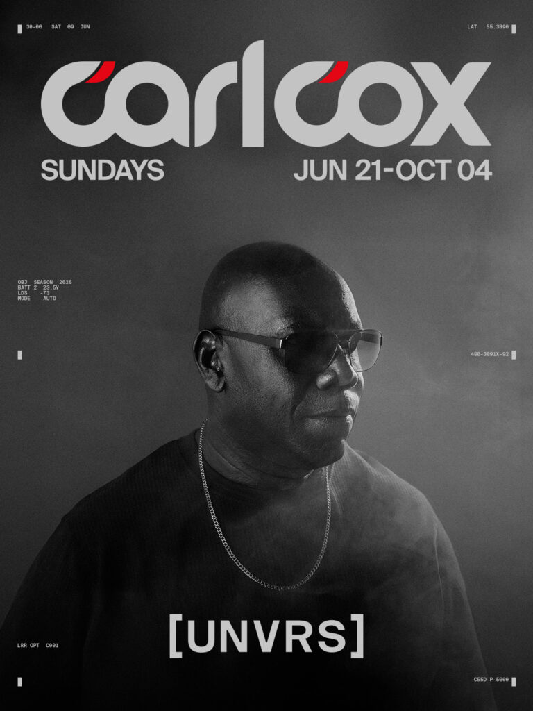 Carl Cox será de nuevo el gran protagonista de las noches de domingo en [UNVRS], liderando 16 fechas y encargándose personalmente de la opening party y la closing party de la temporada. Del 21 de junio al 4 de octubre de 2026