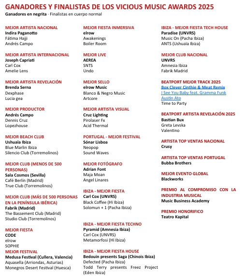 GANADORES Y FINALISTAS DE LOS VICIOUS MUSIC AWARDS 2025