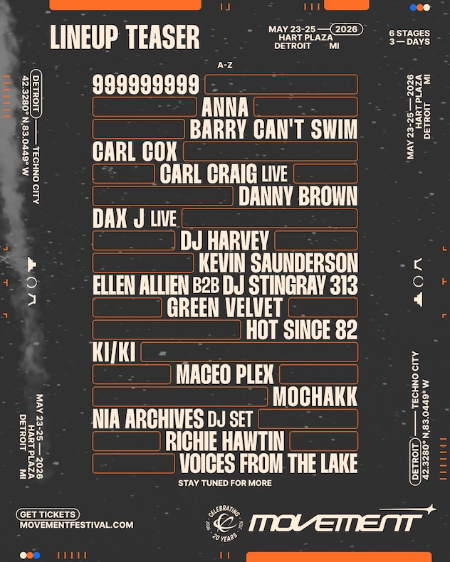 El festival Movement Detroit acaba de revelar los primeros 18 nombres de su esperado cartel 2026, una edición especialmente significativa: el icónico encuentro celebrará su 20º aniversario del 23 al 25 de mayo en su hogar habitual, Hart Plaza, a orillas del Detroit River.